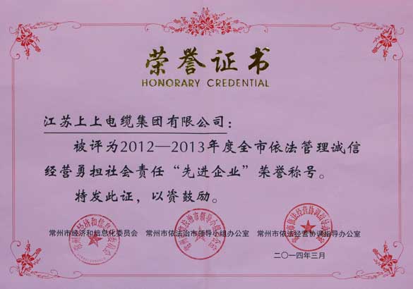 日前,江蘇上上電纜集團(tuán)喜獲“2012-2013年度全市依法管理誠(chéng)信經(jīng)營(yíng)勇?lián)鐣?huì)責(zé)任‘先進(jìn)企業(yè)’”榮譽(yù)稱號(hào)。